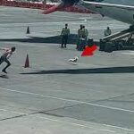 The great escape happened earlier this month at the airport in Guadalajara, Jalisco, Mexico. While the dog appears to think the whole thing is a game, the baggage handlers aren’t too amused, chasing it down and trying to get him under control.